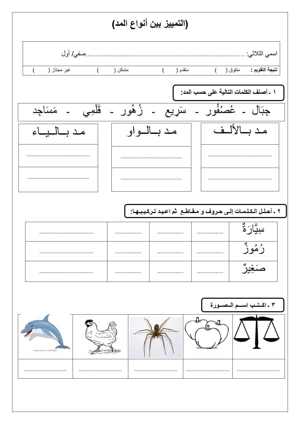 صور رقة عمل لتقييم مهارة المد بالألف والواو والياء PDF