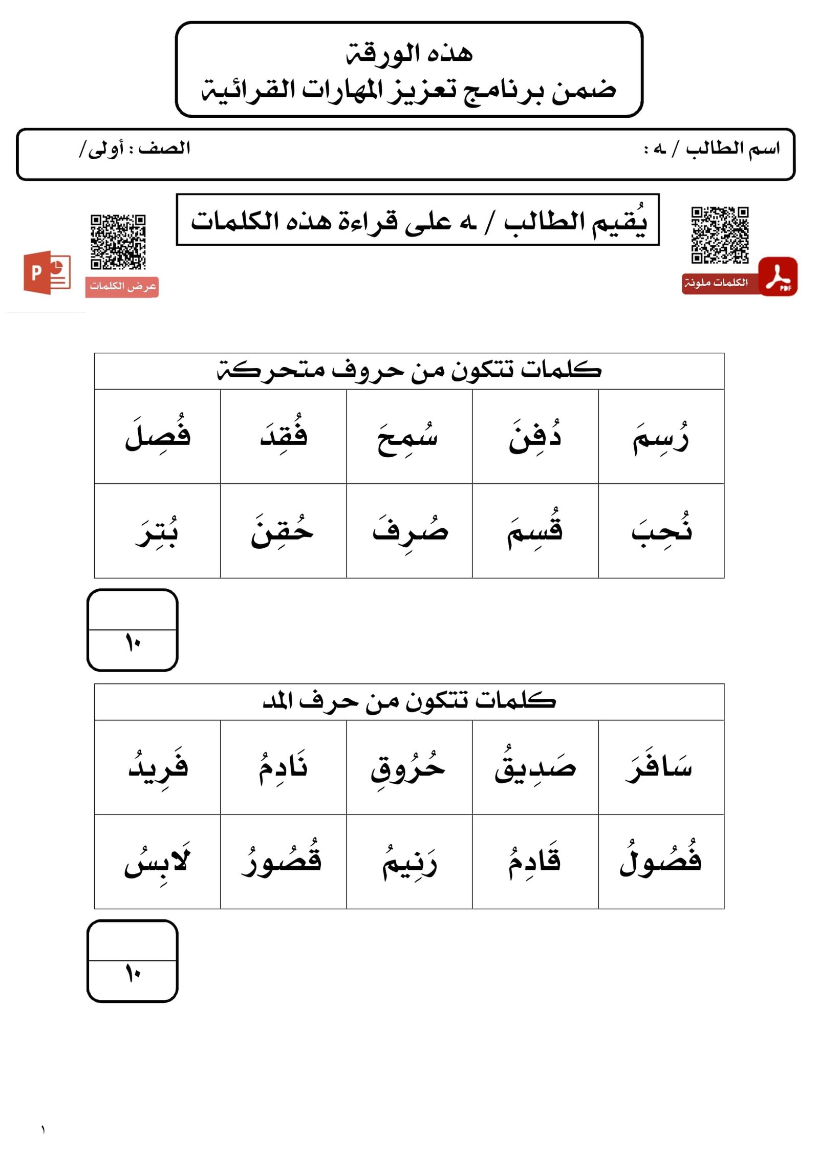 المهارات القرائية: ورقة عمل تعزيز المهارات القرائية pdf تحميل مباشر مجاني لتعزيز وتقيم مهارات القراءة عند طالب الصف الأول.
