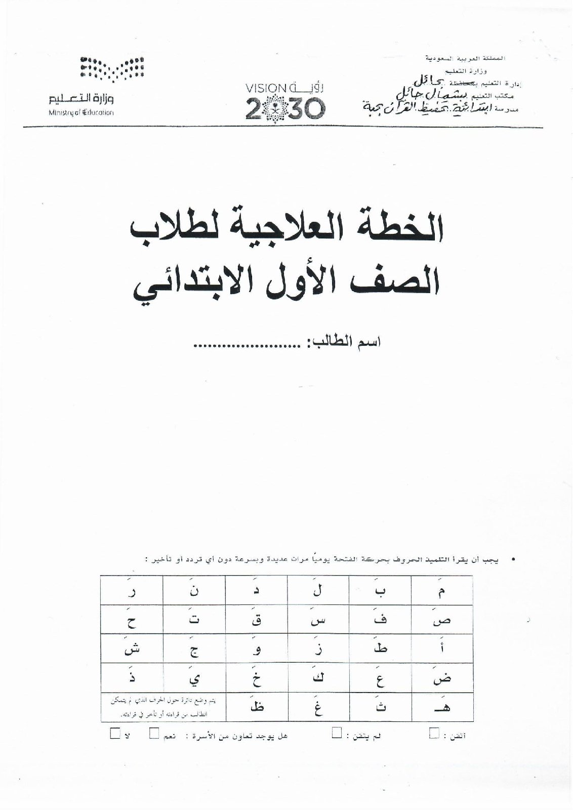 صور مذكرة الخطة العلاجية لطلاب الصف الأول الإبتدائي