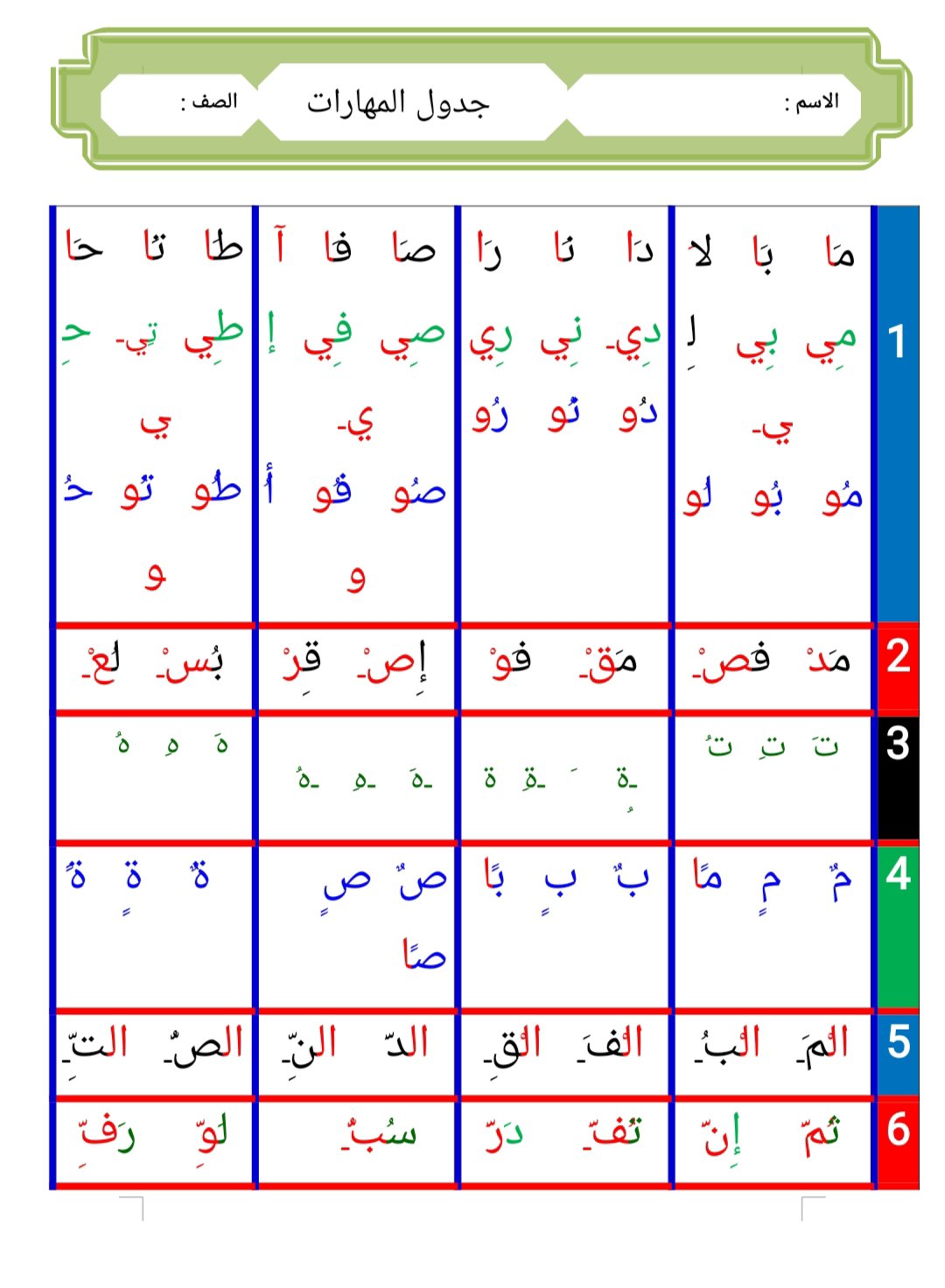صور جدول المهارات في اللغة العربية لتعليم السكون للأطفال