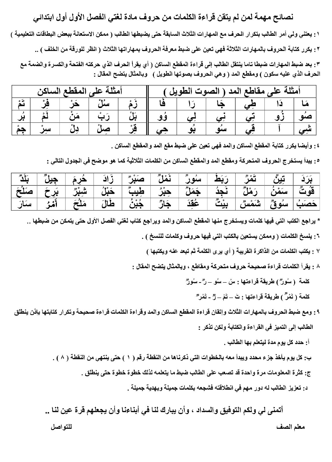 تحميل مذكرة نصائح مهمة امن لم يتقن قراءة كلمات حروف مادة لغتي