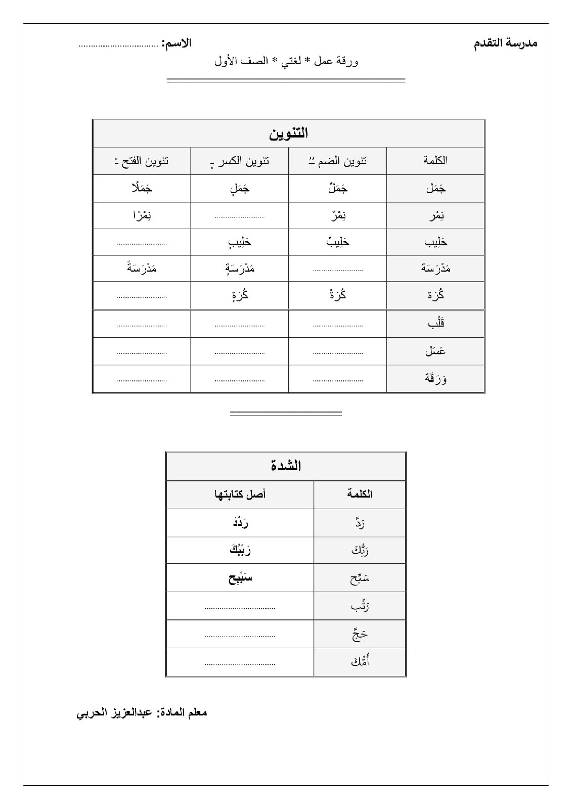 - تتميز المذكرة بالتدريب على مهارة الشدة بقراءة الكلمات.
