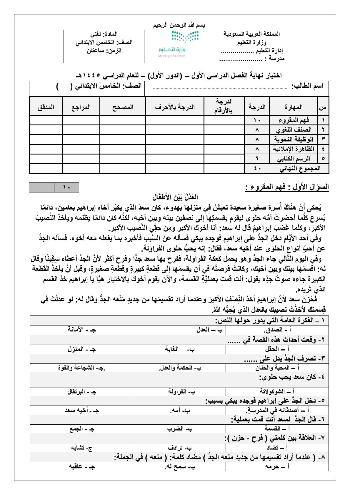 صور من اختبار لغتي الصف الابتدائي الفصل الدراسي الاول