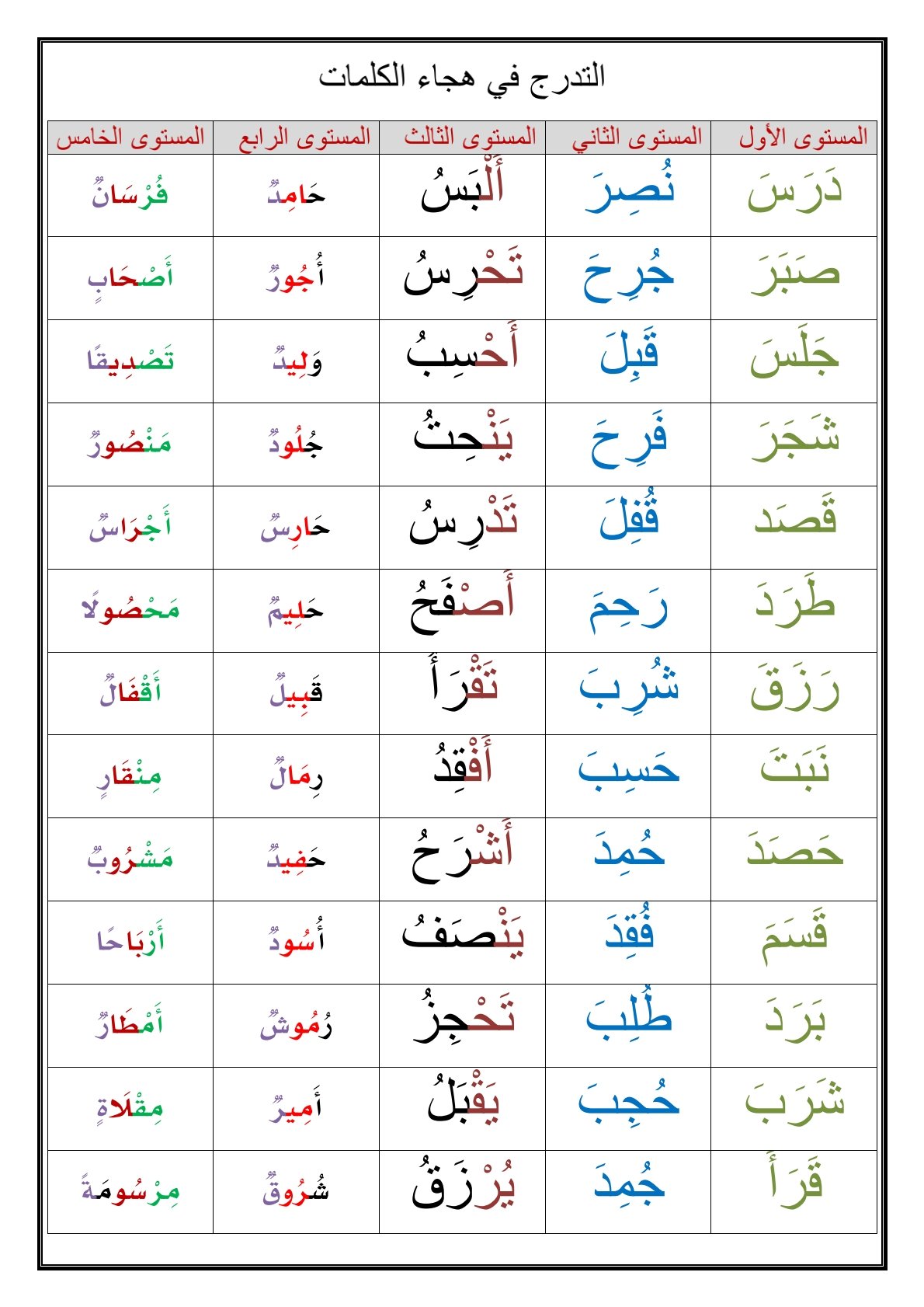 ورقة عمل هجاء الكلمات بالتدريج على 5 مستويات لكل مستوى مجموعة كلمات بحركات مختلفة لإتقان مهارة القراءة والكتابة للأطفال.