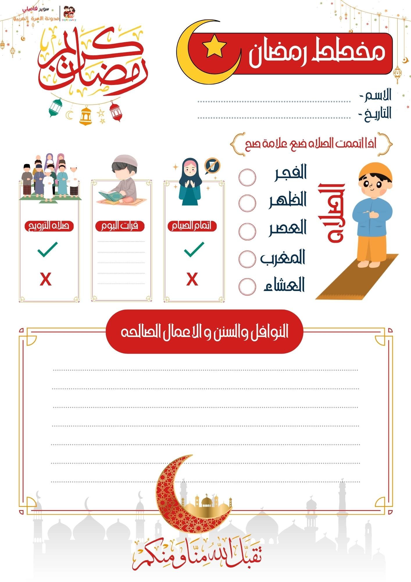 🎨 يحتوي المخطط على تصميم جذاب بالألوان ورسومات محببة للأطفال، مما يشجعهم على الالتزام والمثابرة طوال الشهر الكريم.