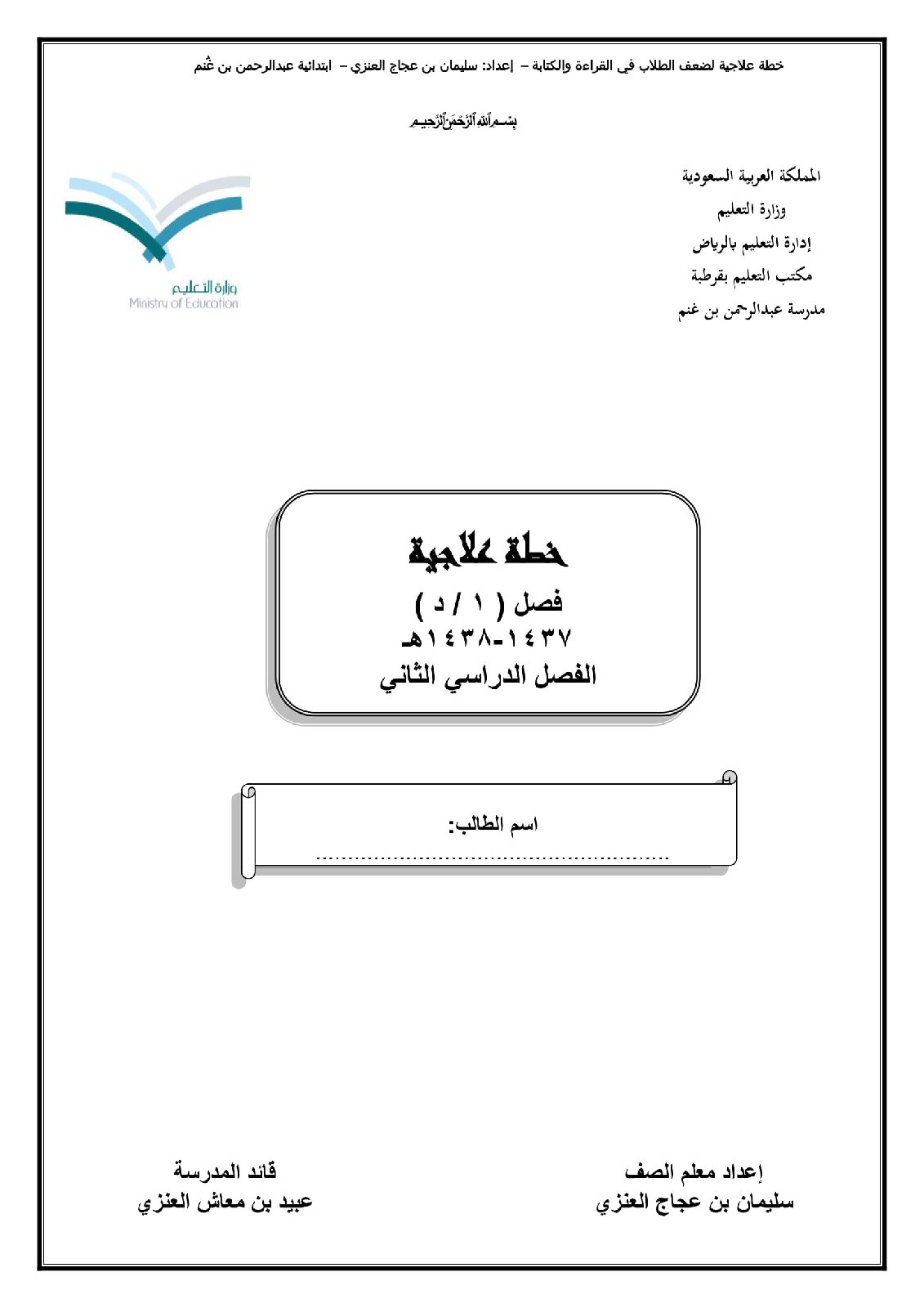 صور مذكرة خطة علاجية لضعف الطلاب في القراءة والكتابة