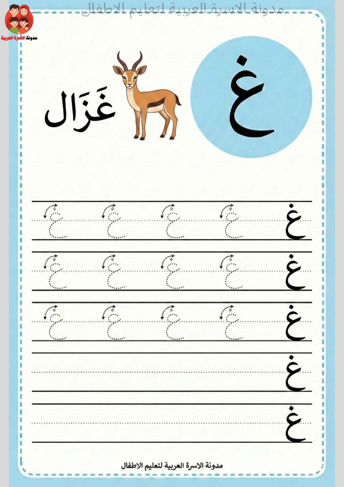 في مدونة الأسرة العربية، ندرك أن الأطفال قد ينسون وضع النقطة أو يخلطون بين الحرفين. ولحل هذه المشكلة، صممنا لكم ورقة عمل كتابة حرف الغين لرياض الأطفال بالتنقيط، التي تركز على رسم المنحنيات بدقة مع التأكيد المستمر على مكان “النقطة” لترسيخها في ذهن الطفل.