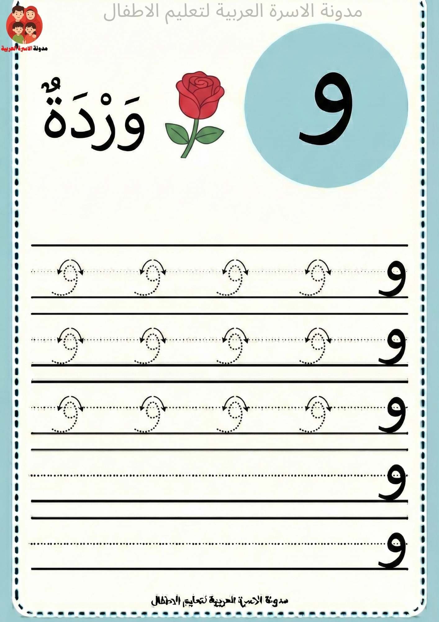 مميزات ورقة عمل حرف الواو (وردة/وجه) 🌟