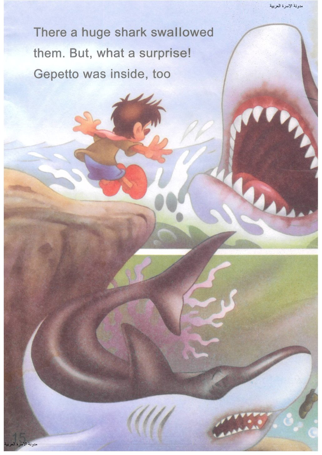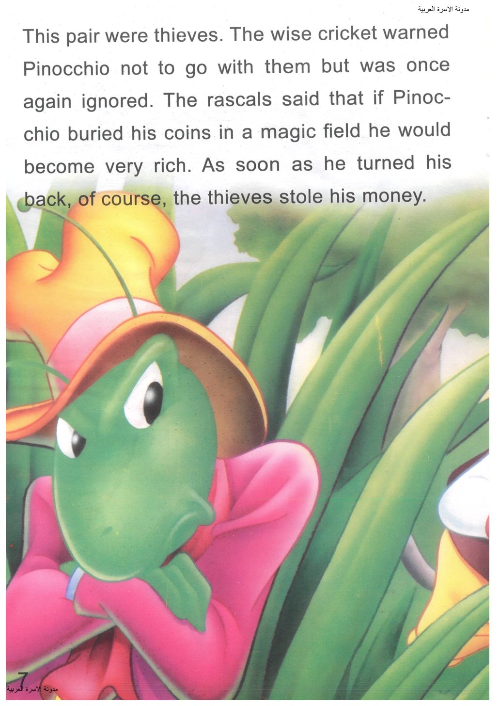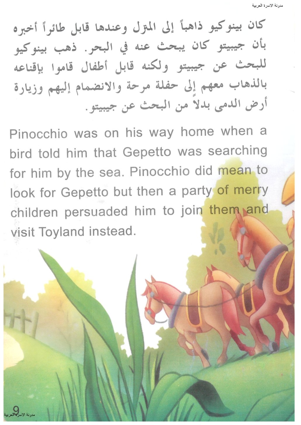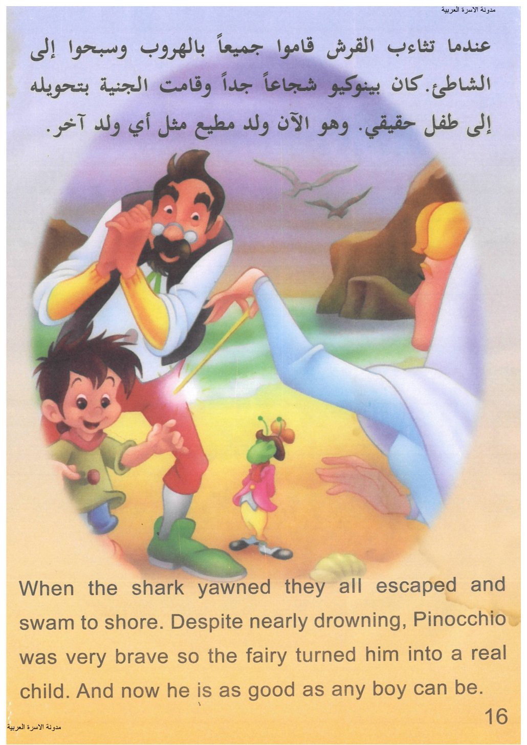 صور من قصة بينوكيو مترجمة (عربي – إنجليزي) لتعليم الأطفال