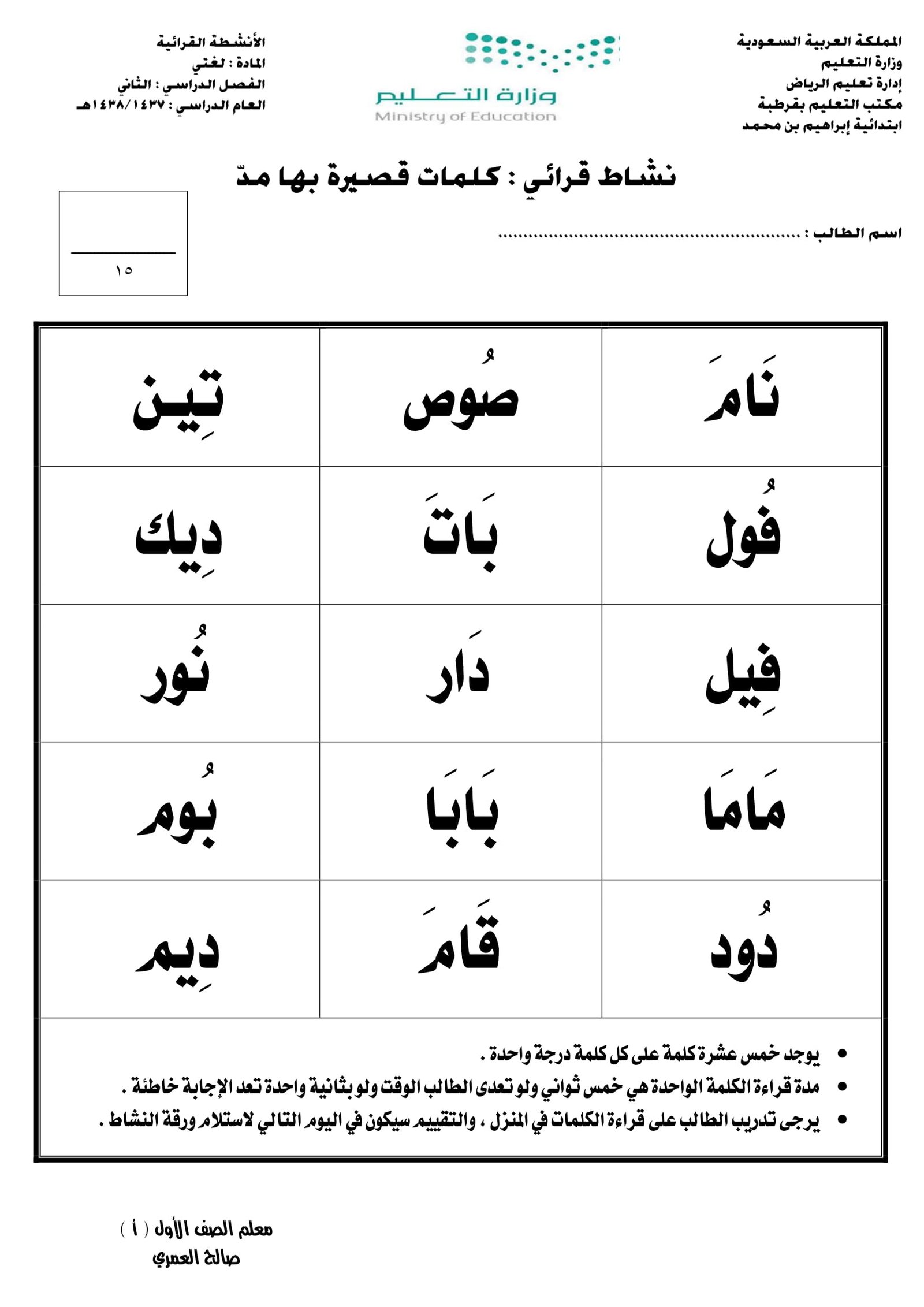 ورقة نشاط قرائي للكلمات قصيرة مع مد pdf تحميل مباشر مجاني