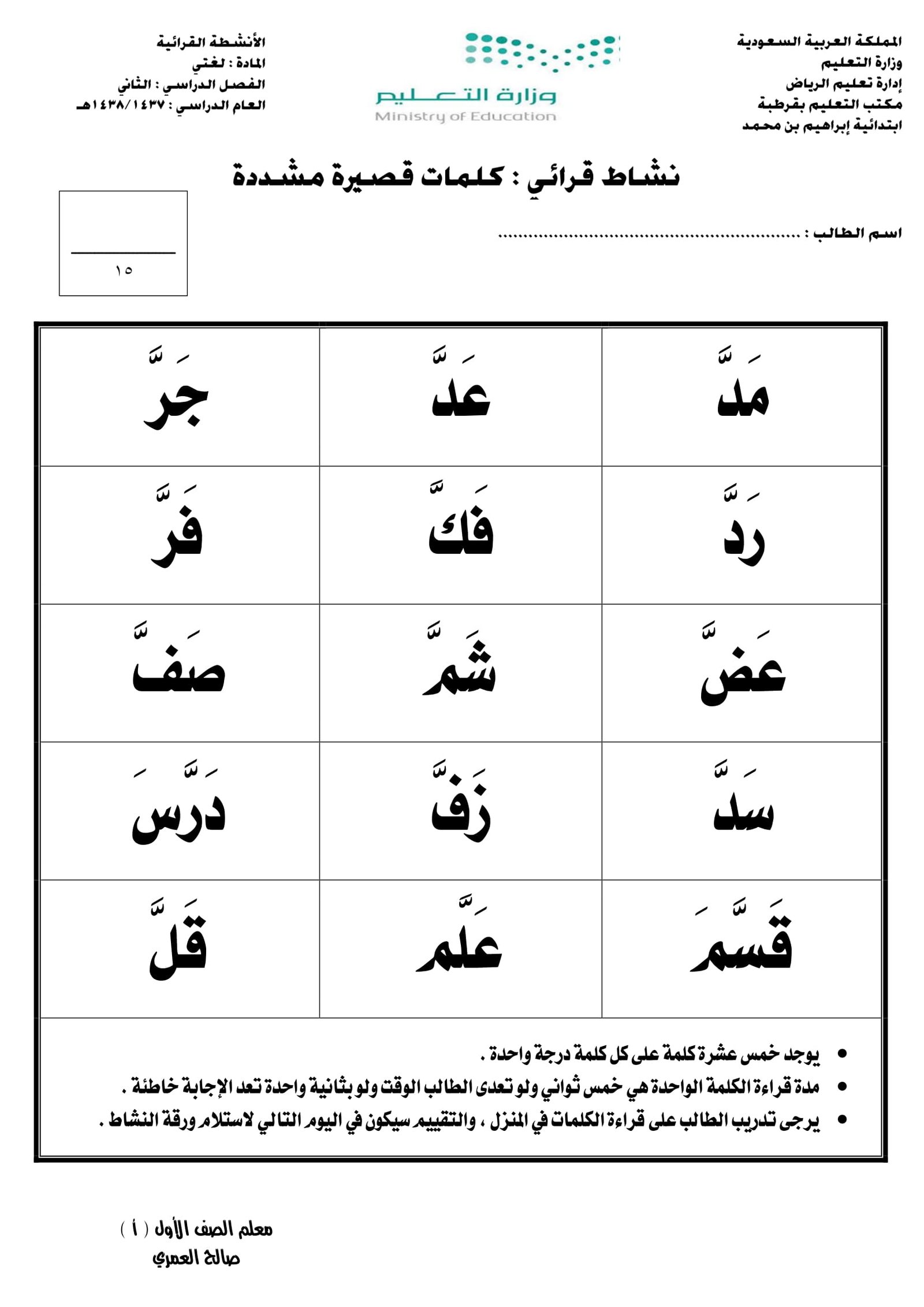 ورقة عمل نشاط قرائي كلمات قصيرة مشددة pdf تحميل مباشر مجاني