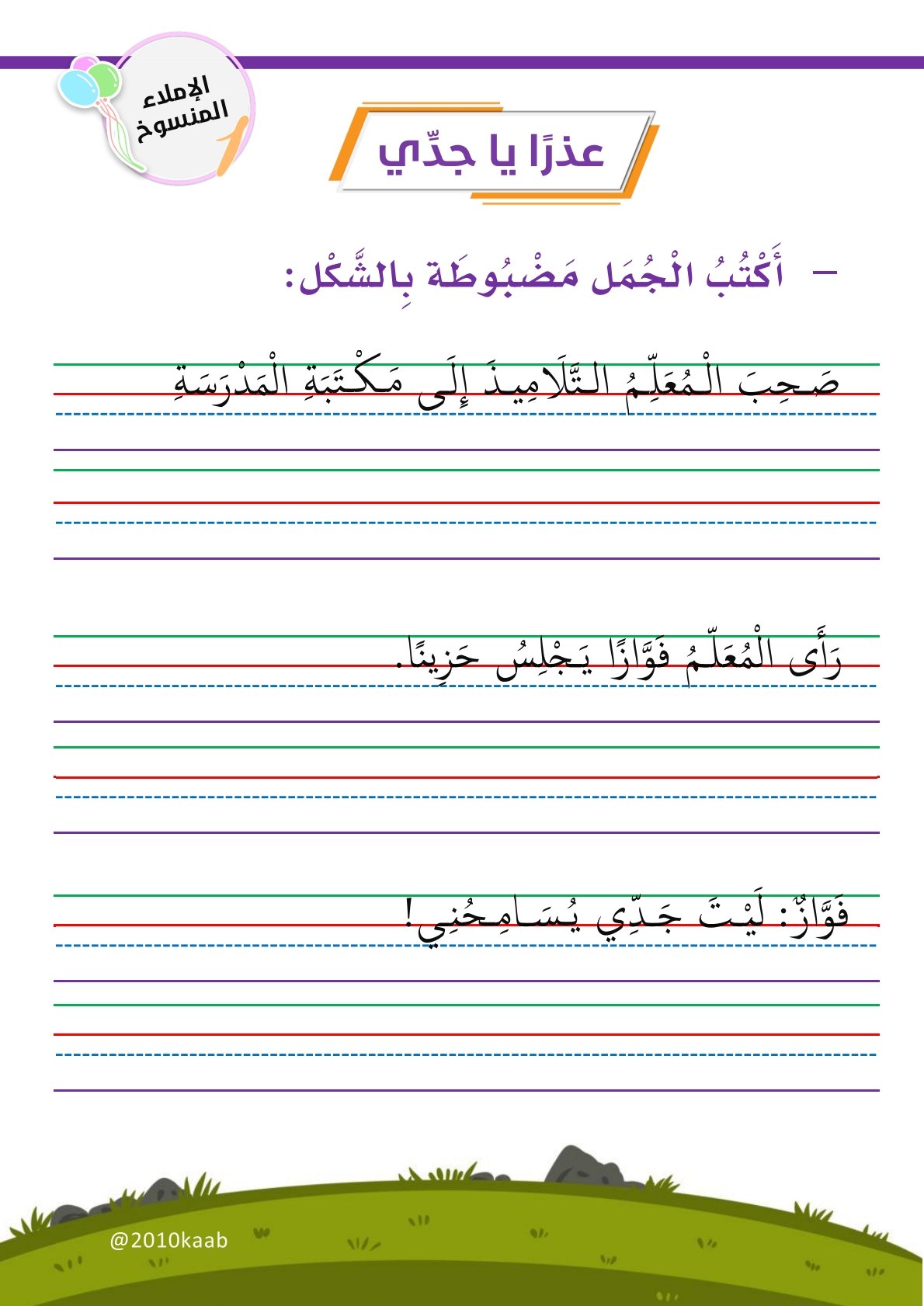 إملاء نص عذرا ياجدي مكتوب لتعليم الكتابة الصحيحة للأطفال pdf تحميل مجاني