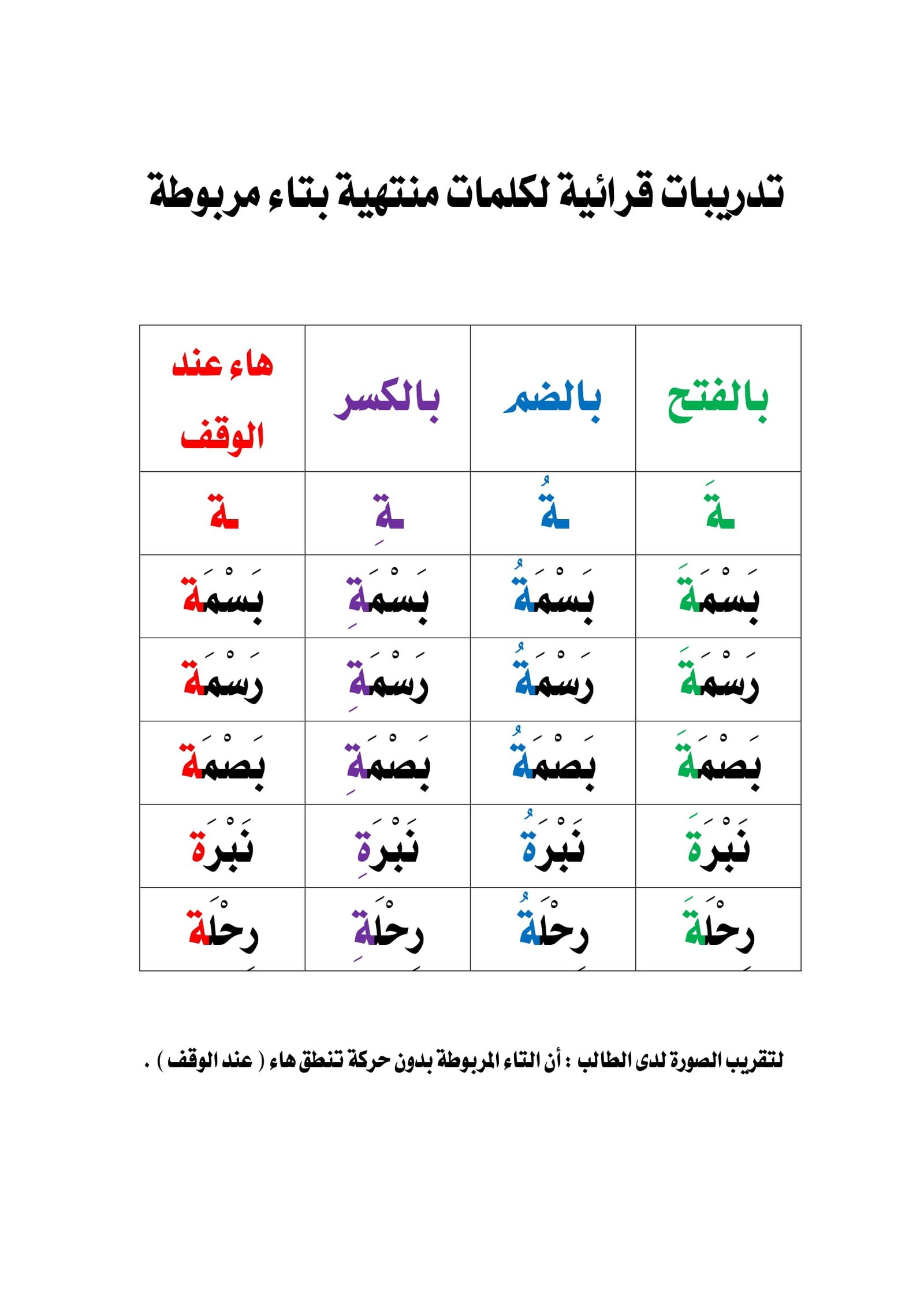 التاء المربوطة للصف الأول تدريبات قرائية على الكلمات المنتهية بالتاء لتعلم الأطفال القراءة الصحيحة. التاء المربوطة للصف الأول ورقة عمل…