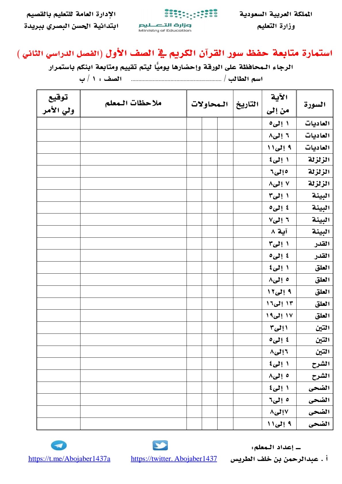 استمارة متابعة حفظ القران للصف الاول ف1