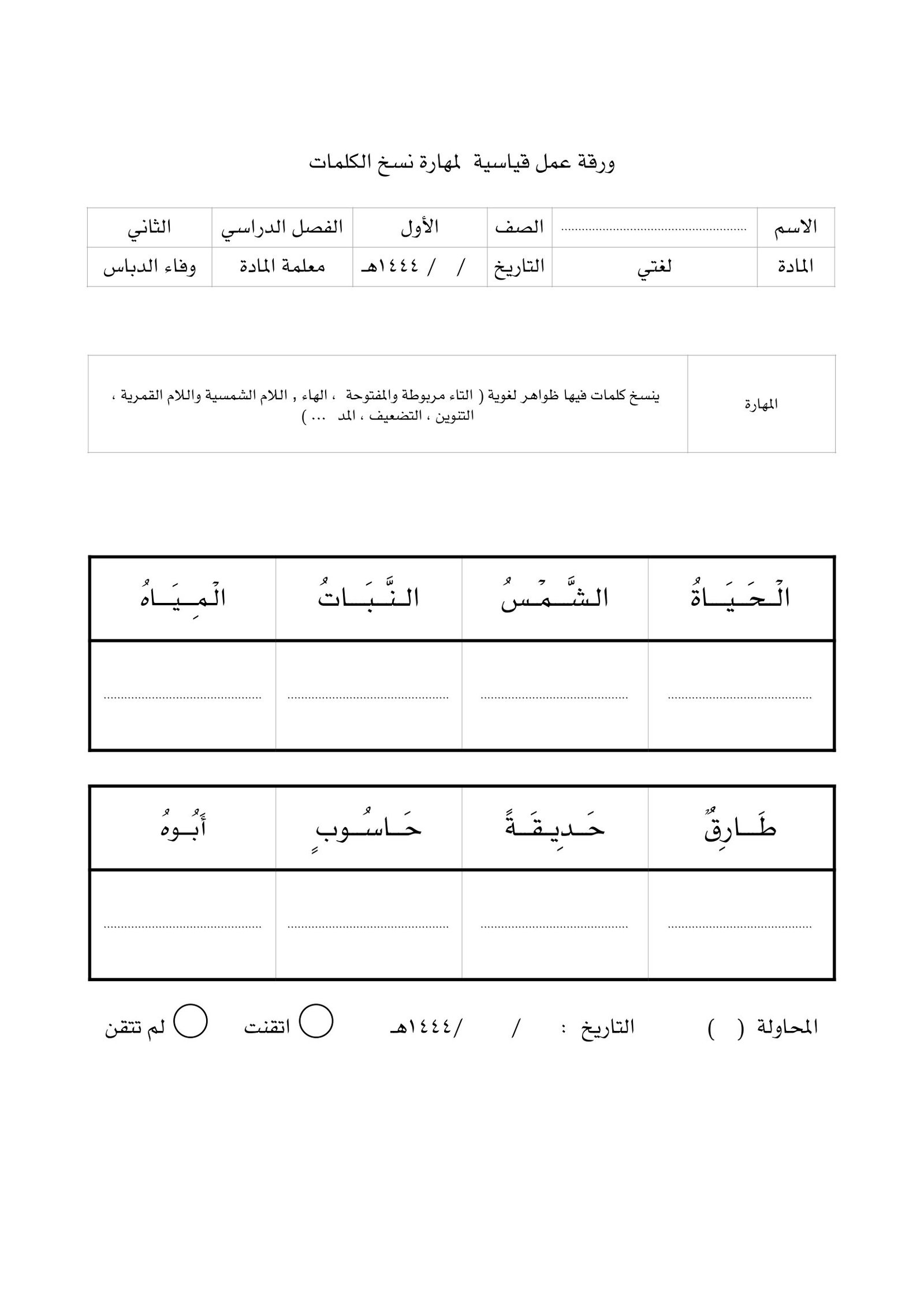 ورقة عمل قياسية لمهارة نسخ الكلمات للصف الأول pdf